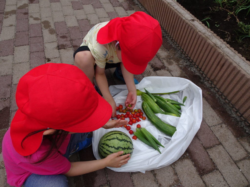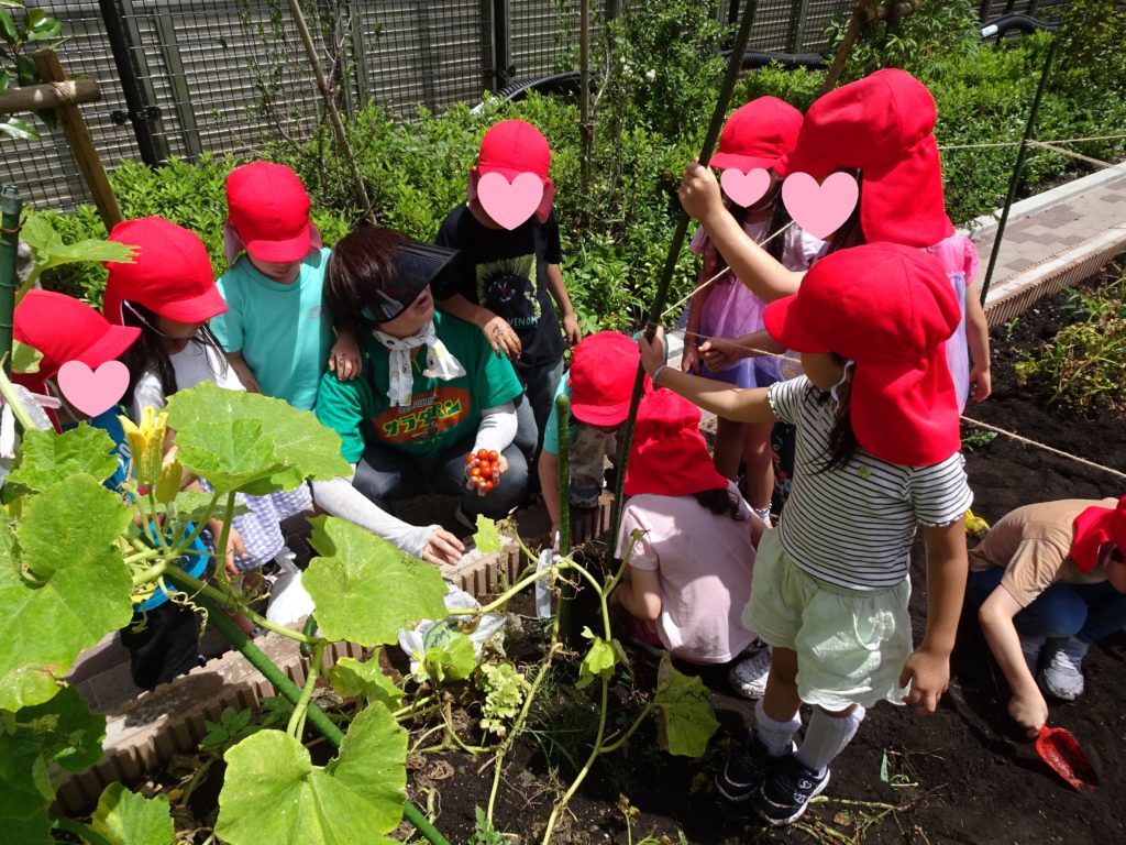 夏本番になると、トマトやナスが色づき始め、子どもたちは毎日「収穫できる野菜はどれかな?」と畑に遊びに行きました。