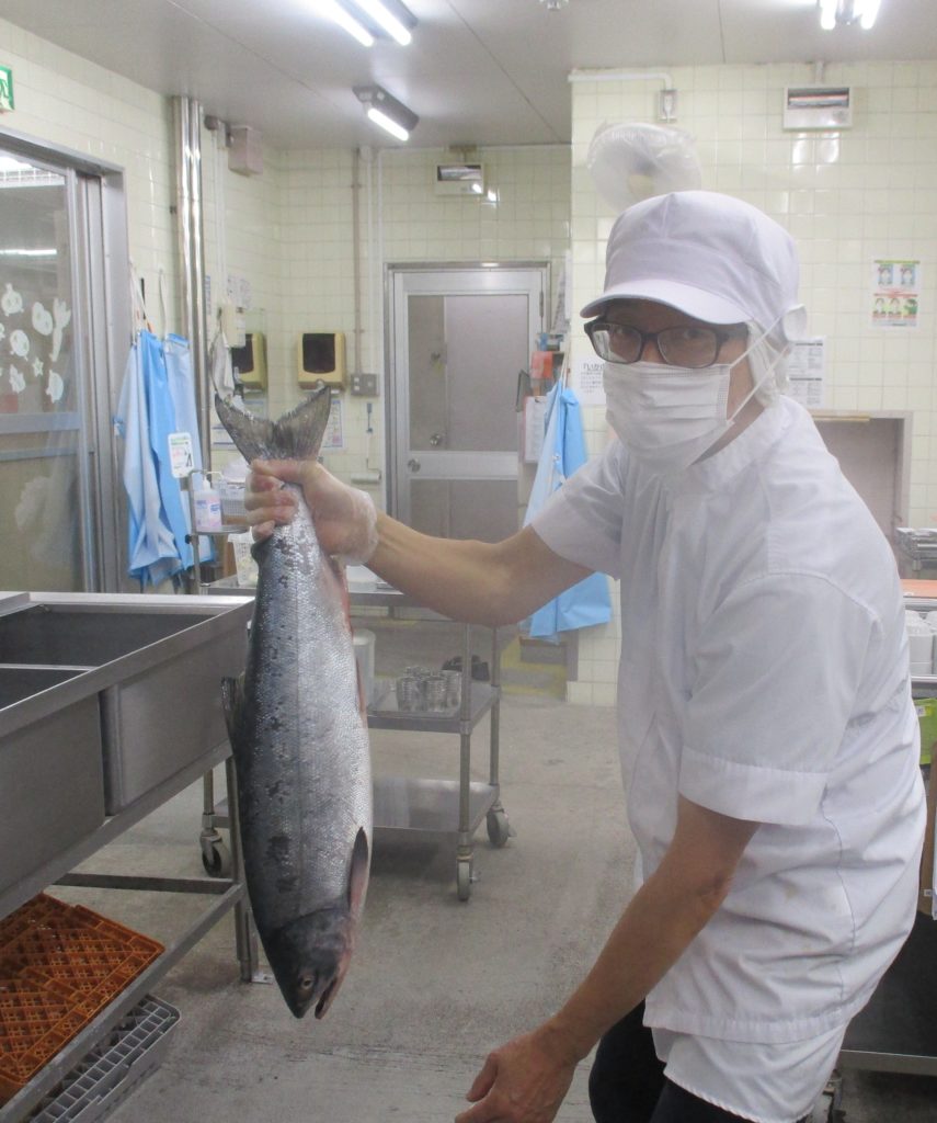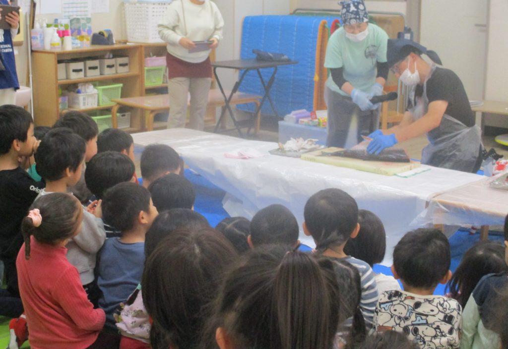 子ども達の目の前で給食室の職員が三枚おろしにしていきます🐟